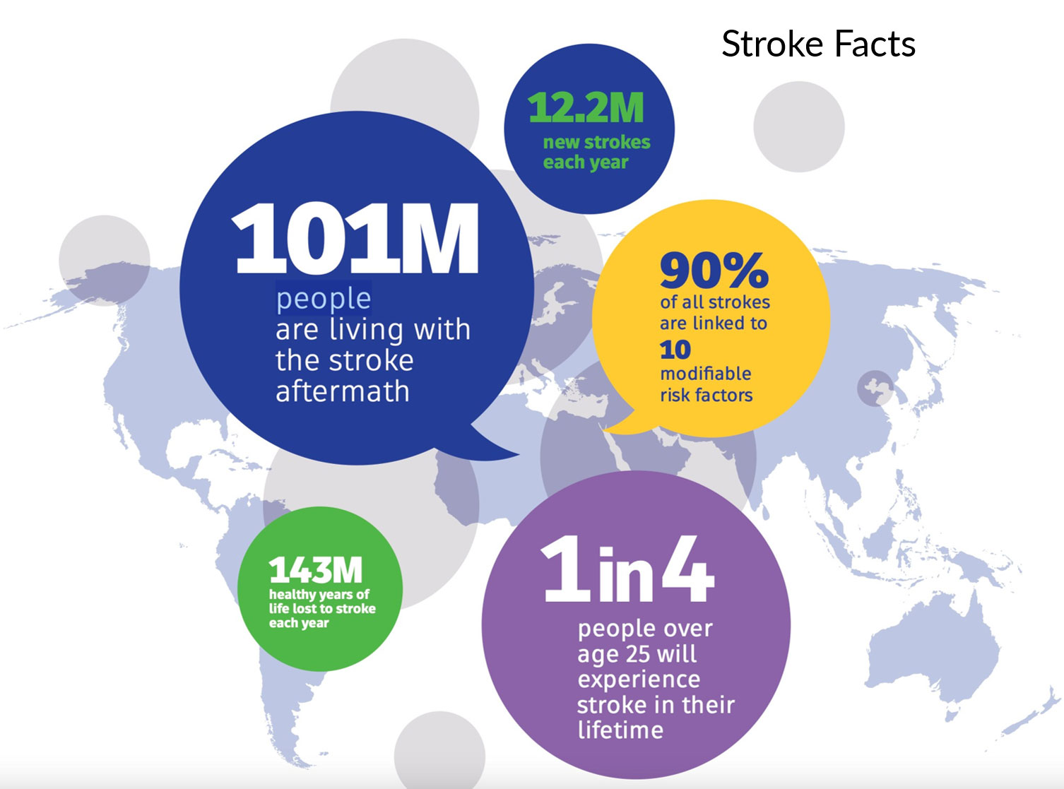 There are 12.2 million strokes every year globally. There are over 101 million patients with chronic stroke with ongoing disabilities. Eighty-seven percent of all strokes are ischemic, which are caused by blocked arteries. * There are no current therapies for chronic stroke, only rehabilitative post-stroke care to improve Quality of Life (QOL).
